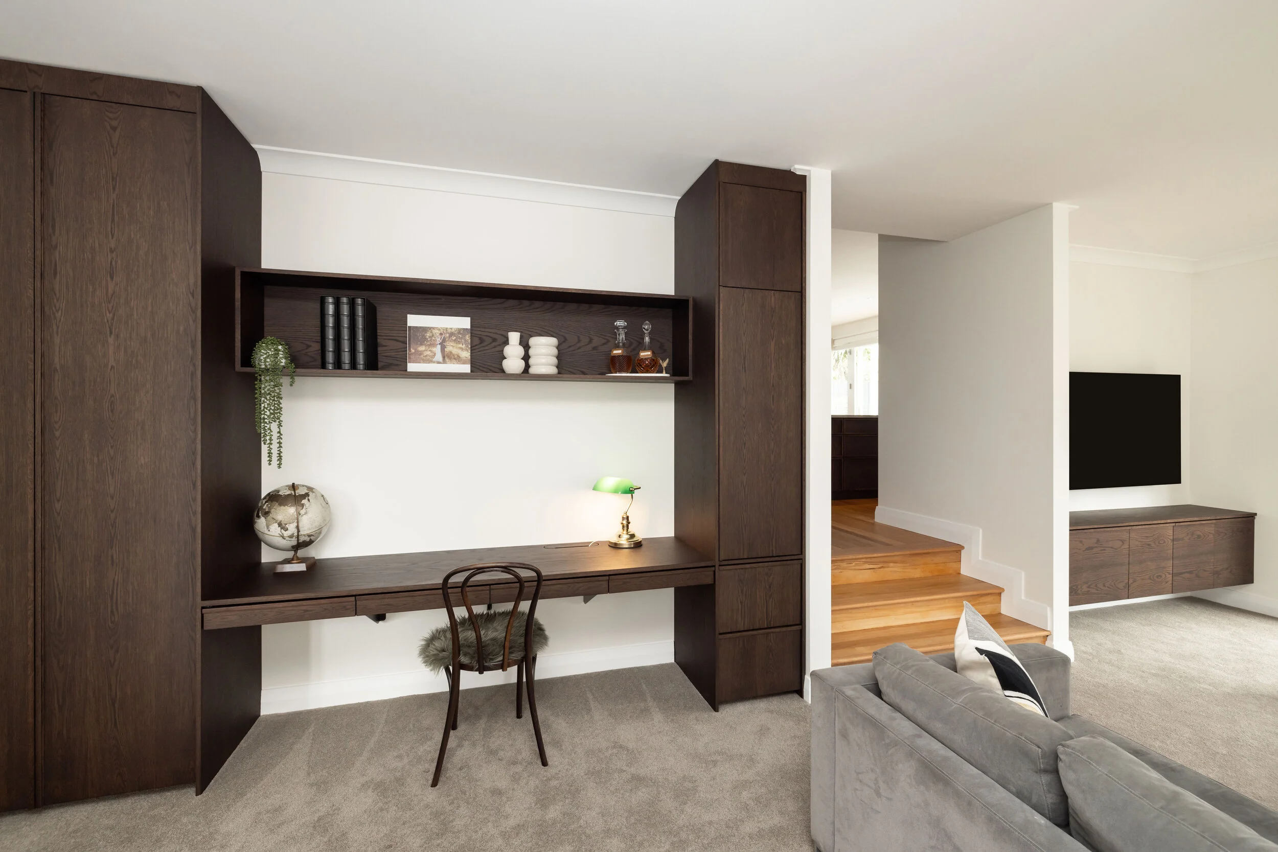 A study along one side of the lower lounge removed the need for an office, while a cabinet on the other side of the lounge stores TV paraphernalia.